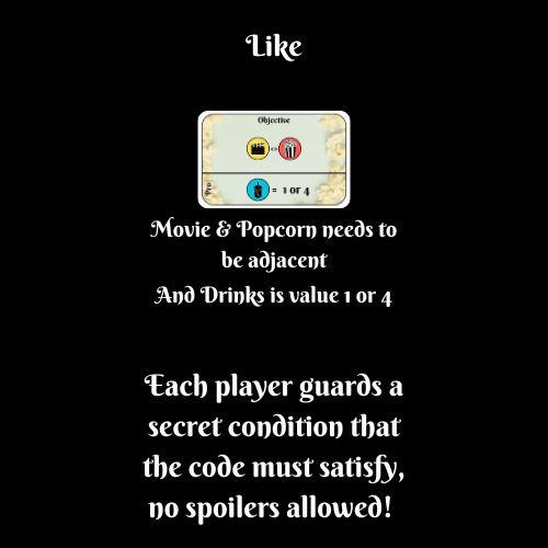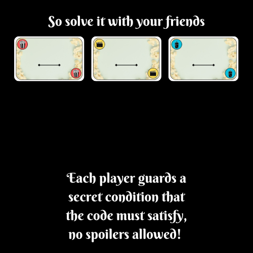 Elke speler heeft een geheime voorwaarde waaraan de code moet voldoen, spoilers zijn niet toegestaan! De uitdaging? Tussen de regels door lezen, je gissingen testen en alles in elkaar puzzelen zonder je geheim prijs te geven.